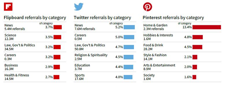 El estudio analiza también para qué tipo de noticias son «referrals» otras redes sociales como Pinterest o Twitter. Este estudio permite a los social media strategist y los community manager de los periódicos afinar más la estrategia y enviar a cada red el contenido que más posibilidades tiene de devolver lectores.