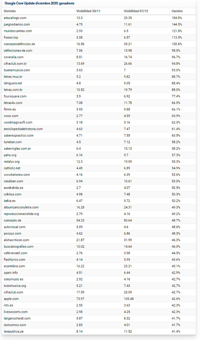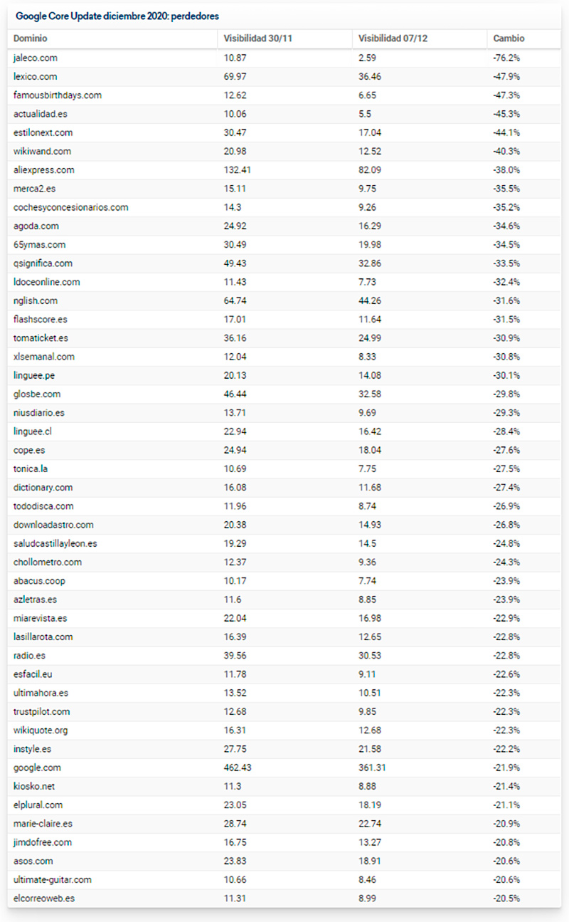Esta es la lista de «ganadores y perdedores» elaborada por Sistrix (los datos fueron tomados el 09.12.2020, a las 15:00 horas).