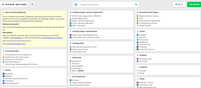 First Draft basic toolkit. Las falsas informaciones sobre el coronavirus pueblan redes sociales e incluso logran incorporarse al discurso de políticos y otros cargos. First Draft ha creado una páginas de recursos para que los periodistas puedan investigar, por ejemplo, si una foto ya se ha usado antes y está descontextualizada, los datos exif, datos de vídeos, etc, así como muchos otros recursos de seguimiento informativo.