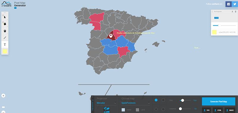 Pixel Map. Pixel Map dispone de todos los mapas de todos los países, con sus correspondientes divisiones, por ejemplo, por provincias. Es posible atribuir colores a cada provincia, con texto o iconos de localización, amén de otras funciones, y exportarlos en distintos formatos. Se le puede dar incluso un formato de píxel a los mapas.