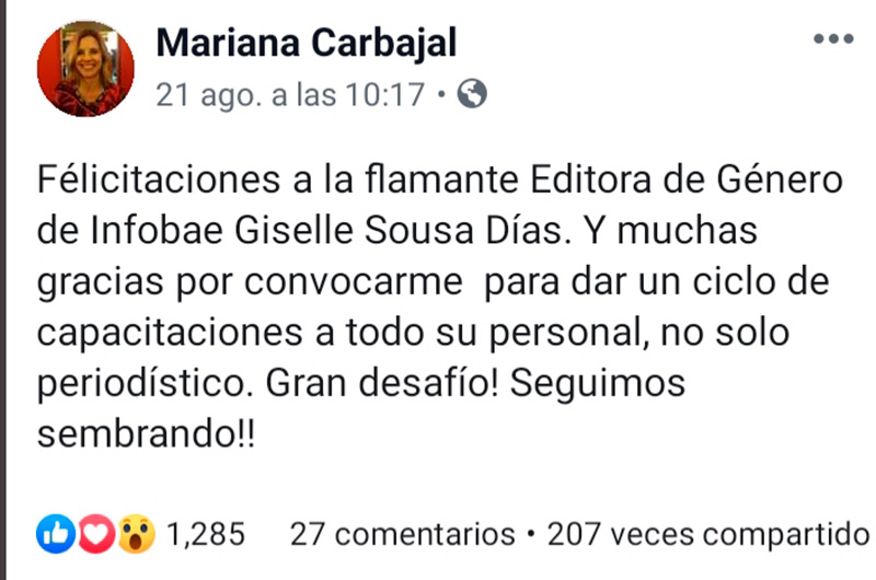 En su cuenta de Facebook la periodista Mariana Carabajal celebra que la capacitación exceda los límites de la redacción