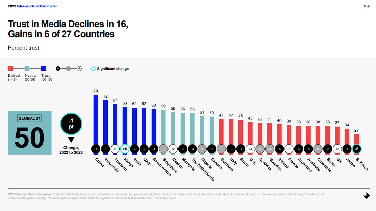 Edelman ha publicado su barómetro anual y dedica, como todos los años, un apartado sobre la confianza de los ciudadanos en las instituciones. En el caso de los medios de comunicación, la confianza sigue cayendo y baja en 16 países y sube en siete, dentro de los países incluidos en el barómetro 2013.