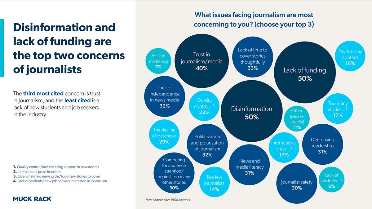 El informe de Muck Rack El Estado del Periodismo 2023 ha puesto sobre la mesa que la desinformación (se citó el 50% de las veces) y la falta de fondos económicos en los medios (también citado en el 50% de las ocasiones) son ya las dos principales preocupaciones de los periodistas. Muck Rack encuestó a 2.226 periodistas de América (Estados Unidos, principalmente) Europa, Asia y África, durante más de un mes, del 4 de enero al 6 de febrero, para comprender el estado actual del periodismo y las perspectivas futuras de la industria.