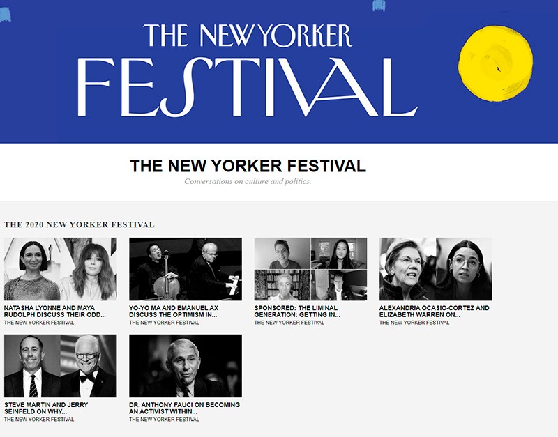 Uno de los medios que ha decidido apostar por una sistematización de los eventos online es The New Yorker, que acaba de anunciar la puesta en marcha de The New Yorker Live, una serie de eventos que permitirá sólo a los suscriptores escuchar, preguntar y obtener respuestas de algunas de las figuras más influyentes de la política, el arte y la cultura. Todos los meses habrá un ciclo de The New Yorker Live, que abordará temas diversos.