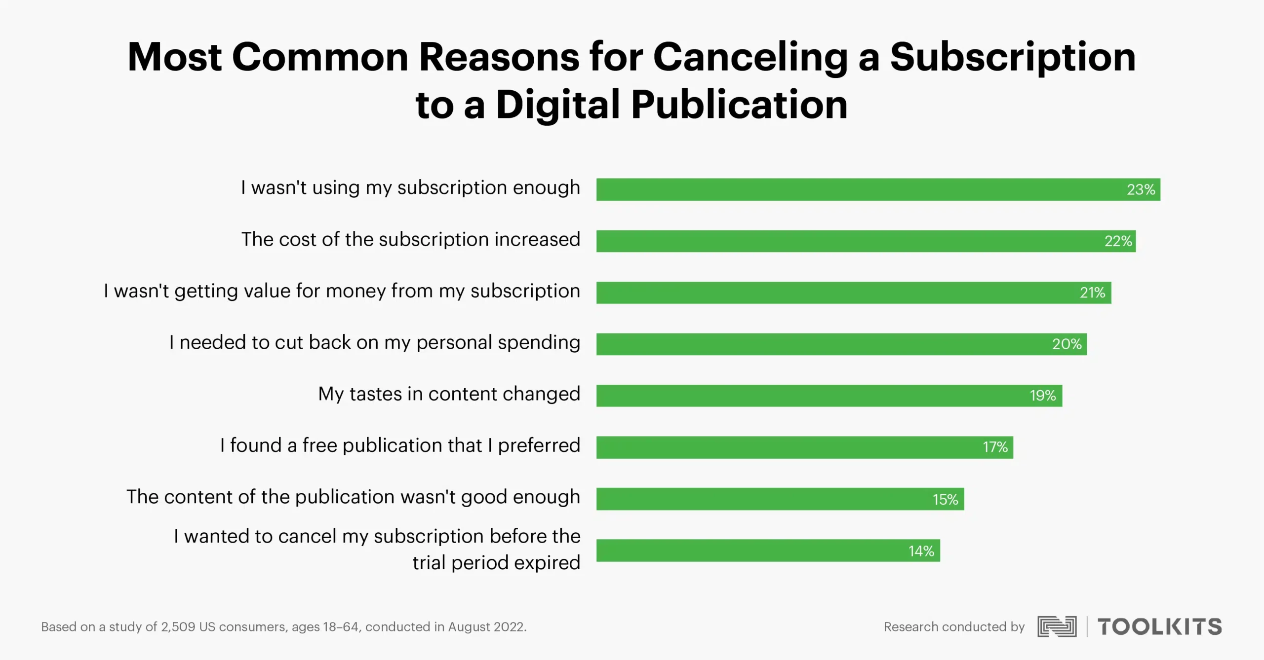 El estudio, realizado por Toolkits y National Research Group, que sirvió también de base para saber que más de la mitad de la gente trata de saltarse el muro de pago, y que coincide en muchos puntos con otras investigaciones realizadas recientemente por otras instituciones, concluye que el veintitrés por ciento de las personas que cancelaron suscripciones dijeron que lo hicieron porque no las estaban usando lo suficiente, el 22 por ciento porque el coste aumentó y el 21 por ciento porque no sentían que estaban recibiendo una buena relación calidad-precio.