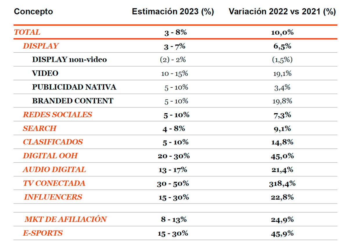 Para 2023, las previsiones son que la TV conectada experimente el mayor crecimiento en inversión publicitaria, seguido de publicidad digital exterior (Digital OOH). La publicidad en vídeo crecerá en torno a un 10-15%, y tanto la publicidad nativa como el branded content entre un 5 y un 10%.