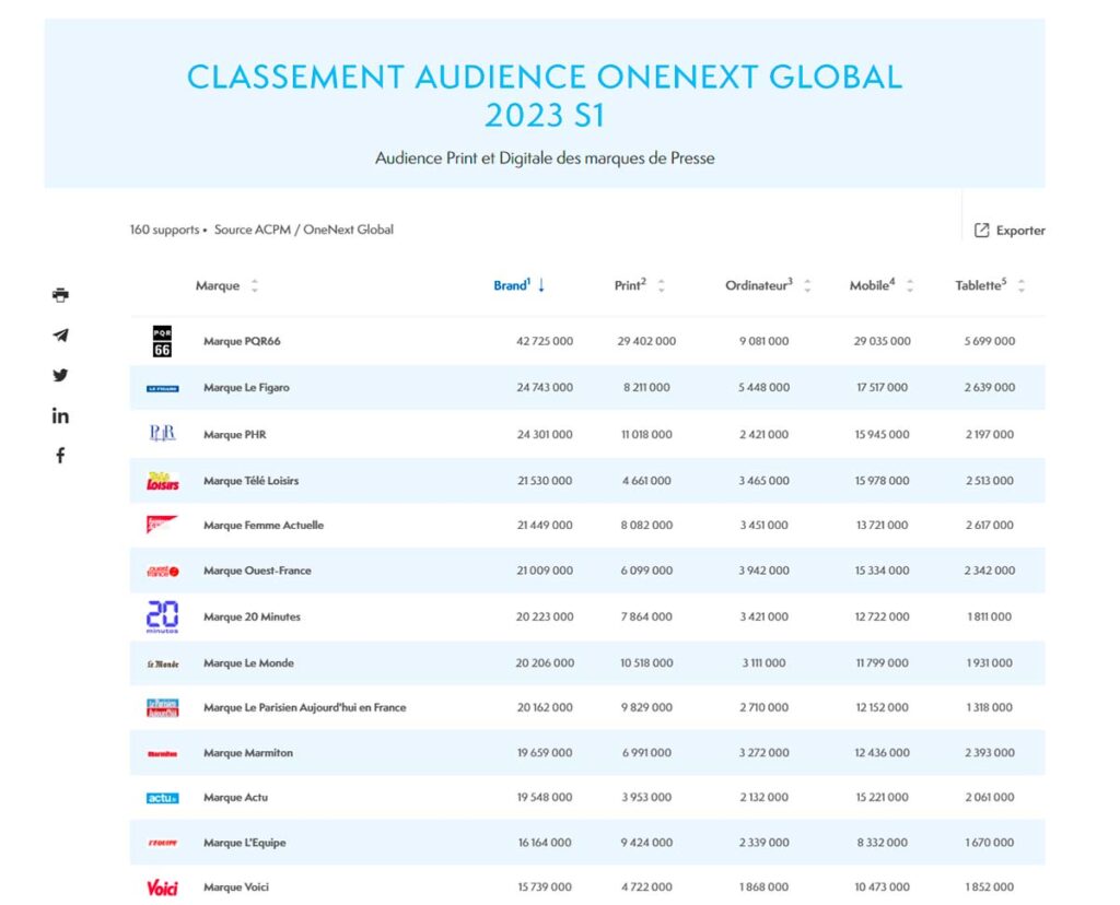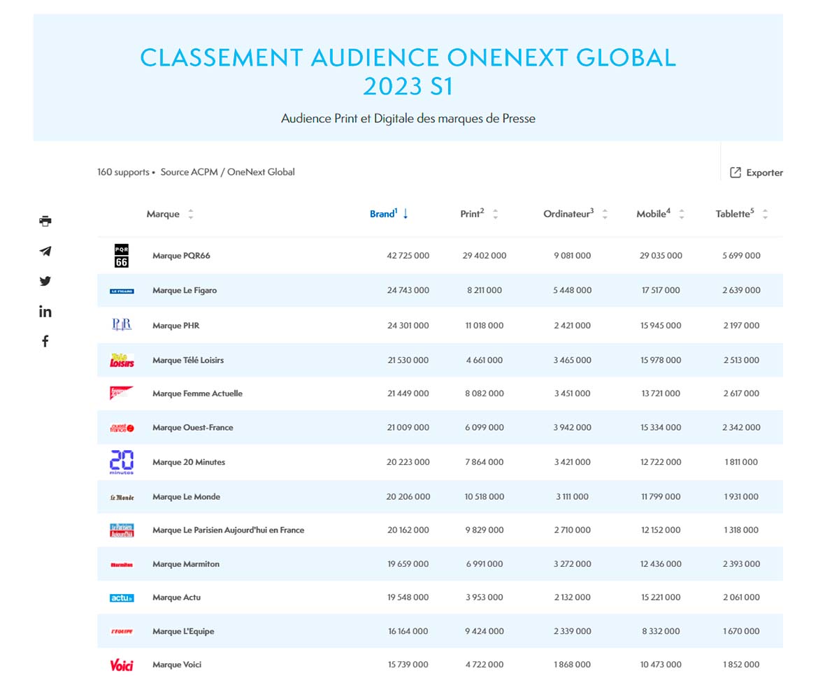 La marca de medios locales y regionales PQR66 (Ouest France, Sudouest, etc.,) sigue siendo la más leída en Francia, según la primera oleada del ACPM (la antigua OJD, que se fusionó en 2015 con SAS AudiPresse). Los resultados combinan tanto audiencia impresa como digital. PQR aglutina 42.725.000 lectores.
