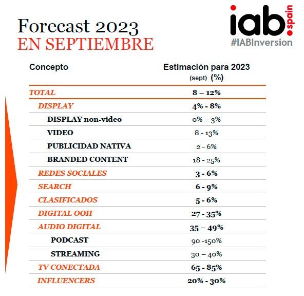 Esta variabilidad se extiende también a las perspectivas futuras. Las estimaciones actualizadas para el cierre de 2023 señalan un crecimiento generalizado en la mayoría de los segmentos. En concreto, la previsión es que la publicidad crezca entre el 8% y el 12%. Particularmente, dentro del display, el Branded Content podría experimentar un aumento de entre el 18% y 25%, lo que sugiere un cambio en la forma en que las marcas interactúan con los consumidores.