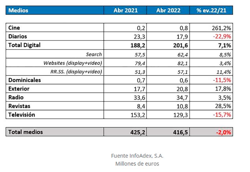 Digital ha crecido un 7,1% frente al mes de abril de 2021, obteniendo 201,6 millones de euros. Dentro de Digital, el mejor comportamiento este mes es para Redes Sociales, que crece un 11,4% pasando de los 51,3 millones de euros en el mes de abril de 2021 a los 57,1 millones del mes analizado.