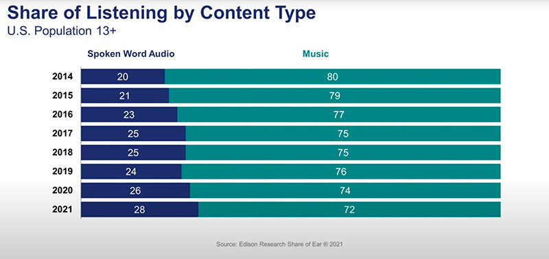 De todo el audio de palabra hablada consumido por los mayores de 13 años, el 22% es para podcasts, un aumento del 176% con respecto a hace siete años (8%).