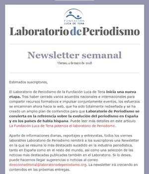 Laboratorio de Periodismo ha iniciado hoy la publicación de la newsletter semanal, en el que se da un breve repaso a algunos de los temas más destacados que se han dado a conocer durante la semana en la prensa especializada, tanto internacional como española.