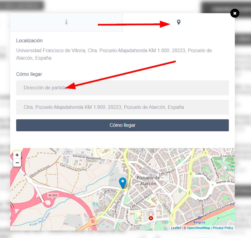 En muchos de los actos que se realizan físicamente, hay una pestaña en la que se ofrece la localización exacta de la sede del evento, y la opción de, tras introducir el punto de partida, obtener las indicaciones exactas para llegar, ya que la sede del evento ya queda registrada en el campo de destino, tal como muestra la fotografía. Un mapa, además, sitúa el lugar del evento.