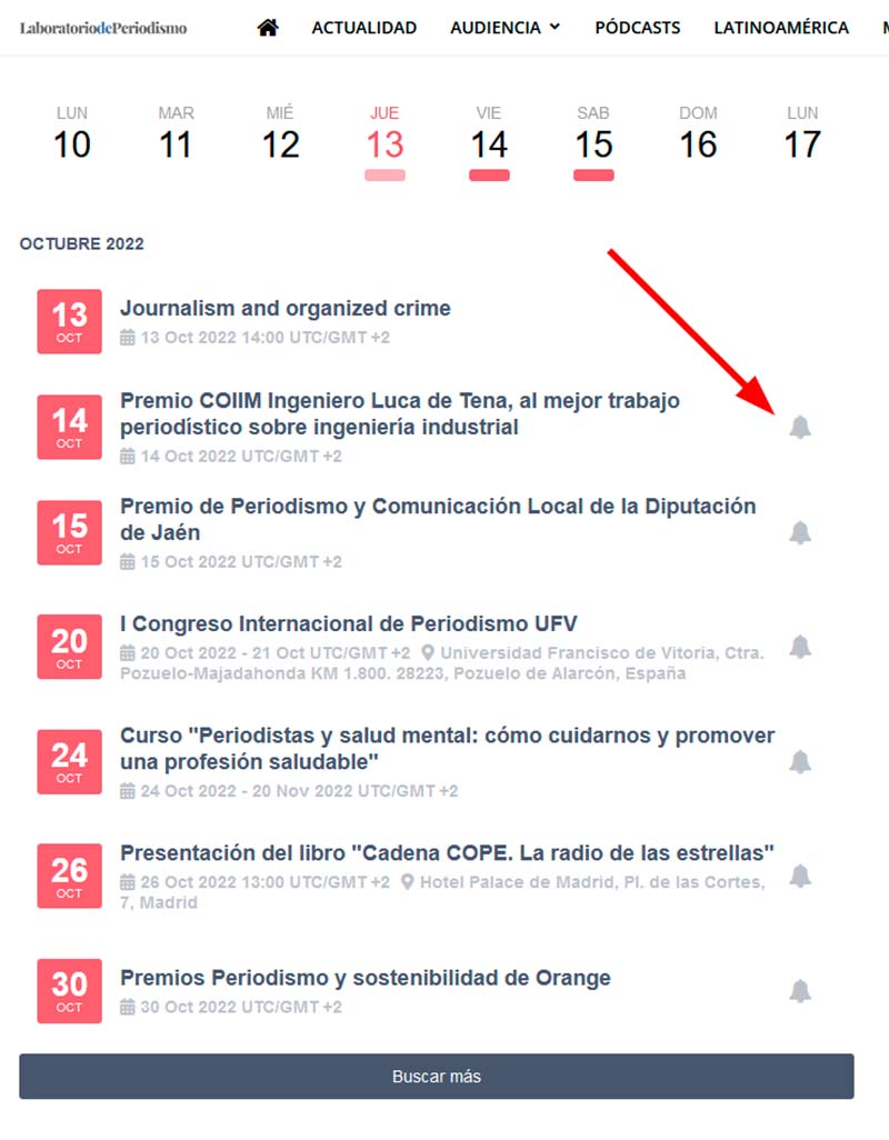 Pero además, cabe la posibilidad de recibir un correo que le recuerde un evento. Para ello, pinche en el icono de la campana que aparece junto a cada evento, como muestra la siguiente imagen: