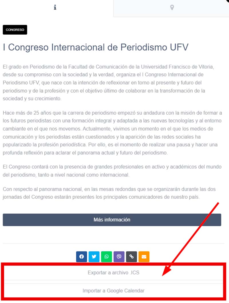 Al final de cada evento, hay dos botones, para exportar el acto en formato .ICS o agregarlo a Google Calendar