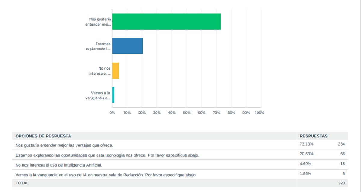 En línea con los puntos marcados anteriormente, casi 7 de cada 10 encuestados dijo que le interesaría que en su medio puedan recibir entrenamiento sobre cómo aumentar usuarios o conocer mejor a las audiencias, desarrollo de estrategias en redes sociales e Inteligencia Artificial (para entender, sobre todo, las ventajas que tiene su uso en los medios de comunicación).