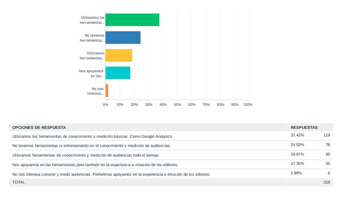 Las otras opciones elegidas por los encuestados, que rondaron entre el 30 % y el 40 %, tienen que ver con mejoras en entrenamiento y estrategia en SEO; medir, monitorear y conocer mejor a la audiencia; mejorar o ampliar la oferta editorial; contratar a más personal especializado; y mejorar la experiencia de nuestros usuarios. Un 25 % cree que sería necesario incorporar herramientas para trabajar en contenidos multimediales.