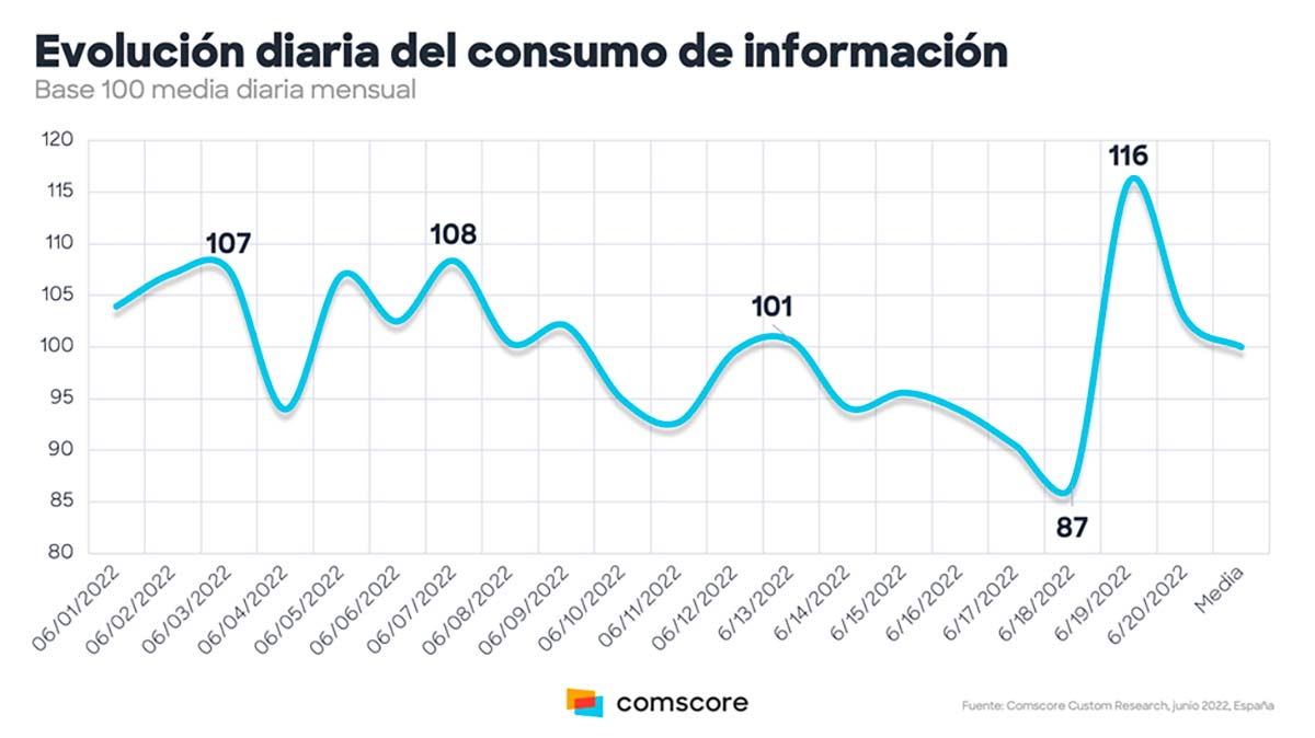 Con respecto al mes de las elecciones y en base a los datos de consumo recogidos censalmente por Comscore, se observa que el día 19 de junio 2022, el interés por los contenidos informativos de estos medios digitales, se dispara.