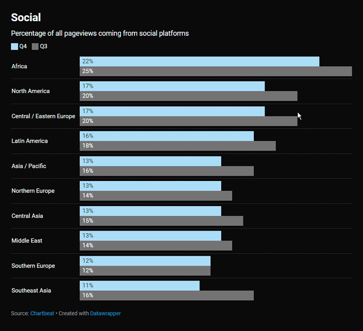 Según los datos que ha hecho públicos la empresa de analítica en tiempo real Chartbeat, implementada por miles de medios de todo el mundo, casi todos los periódicos de su red, de casi todos los países del mundo, experimentaron en el último cuarto de 2022 una caída de páginas vistas procedentes de redes sociales. En concreto, la caída alcanza el 5% de retroceso en algunas zonas geográficas como el sudeste asiático.