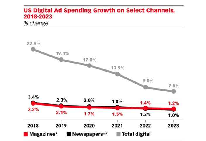 El año pasado, la industria de las revistas impresas volvió a sufrir una disminución significativa en los ingresos publicitarios en Estados Unidos. El gasto en publicidad en revistas impresas, incluidos los domingos, disminuyó un 18 por ciento, según datos compilados por eMarketer. En concreto, de unos ingresos de 10.940 millones de dólares en 2017 se pasó a a 8.970 millones en 2018.