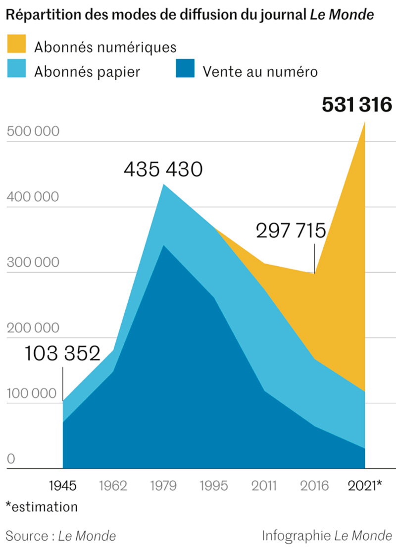 Desde entonces, la circulación de pago de Le Monde ha batido récords: la de 1979 fue superada en noviembre de 2020 y luego mejoró ocho veces, según las estadísticas mensuales, para llegar a 531.000 suscriptores en diciembre de 2021. Esta cifra tiene en cuenta todas las suscripciones y ventas al exterior, aunque la Alliance for Press and Media Figures (ACPM)le otorgará 446.000 para 2021, al tener un sistema de contabilidad distinto.