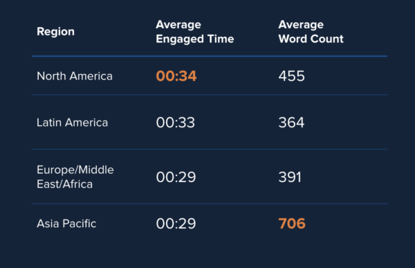 Es en el análisis de la longitud típica de los artículos publicados en cada región en donde salta una probable relación entre artículos cortos y más engagement. Según Chartbeat, «los sitios en América Latina tienden a publicar artículos con menos palabras en promedio, pero tienen el tiempo promedio de participación más alto, con 34,3 segundos. Por el contrario, los sitios de la región de Asia y el Pacífico tienen artículos con la mayor cantidad de palabras, pero el tiempo promedio de participación más corto con 28,8 segundos». Los sitios en América del Norte y Europa se ubicaron en algún punto intermedio, como muestra la siguiente gráfica.