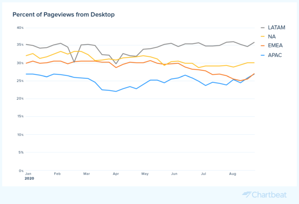 En 2020 -confirman desde Chartbeat- «en realidad sólo vimos una ligera disminución en el tráfico desde ordenadores de escritorio como porcentaje del tráfico total, en contraste con las fuertes disminuciones que hemos visto en años anteriores. Aunque el tráfico de ordenadores de escritorio continuó disminuyendo, su ritmo sugiere que más lectores estaban usando esos dispositivos a medida que se establecían en su nueva normalidad».