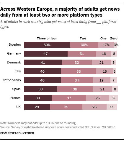 Aunque los europeos occidentales prefieren recibir noticias de la televisión, es importante tener en cuenta que tienden a depender de más de una plataforma. La mayoría de los ciudadadanos de los ocho países de Europa occidental encuestados reciben noticias diariamente a través de dos o más canales. Y en algunos países, como Suecia y Alemania, alrededor de la mitad de los adultos reciben noticias diariamente por tres o cuatro canales diferentes.