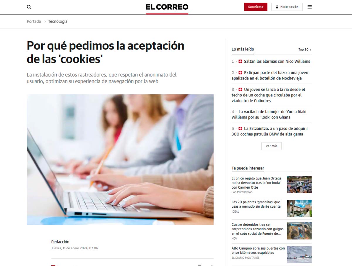 En este contexto, algunos medios de Vocento, como El Correo, han amanecido hoy con una explicación detallada sobre la importancia de la aceptación de cookies en su plataforma. Según el medio, la instalación de cookies, que respeta el anonimato del usuario, es esencial para optimizar la experiencia de navegación. Las cookies permiten sugerir contenidos en función de los gustos e intereses del lector y facilitan la oferta de publicidad eficaz y personalizada.