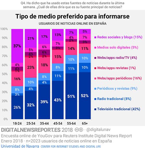 Para los internautas de 18 a 44 años, el 34% prefiere la televisión, el 22% las redes sociales y blogs; y el 19% escoge los sitios web y aplicaciones de periódicos (en este grupo de edad suben 3 puntos con respecto a 2017).