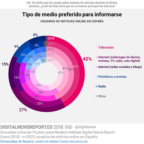 La televisión sigue siendo el medio preferido de los internautas (42%) para informarse, según el Digital News Report 2018. Según los resultados del estudio, destaca la recuperación de los sitios web y aplicaciones de periódicos y revistas (17%), con el mismo porcentaje que en 2016 y dos puntos más que en 2017, y se sitúan de nuevo por encima de las redes sociales y blogs (15%), que detienen su tendencia ascendente y se sitúan en tercer lugar.