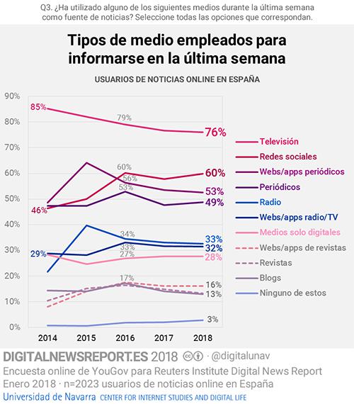 En 2018, los medios más utilizados son la televisión (76%), las redes sociales (60%), los periódicos digitales (53%) y los diarios impresos (49%). En general, se mantienen los porcentajes de 2017, con variaciones de solo 1 o 2 puntos.