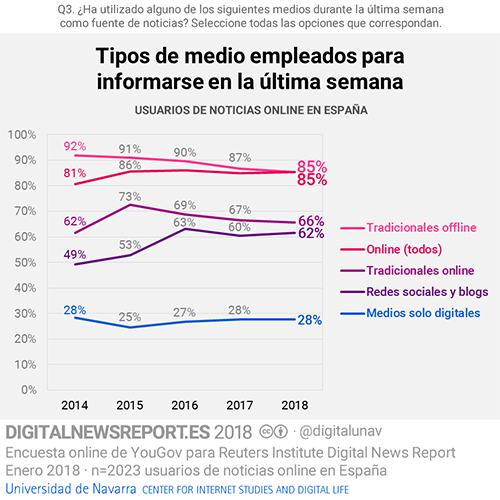 La radio mantiene seguimiento desde 2016 y es escuchada por el 33% de los internautas. También es el caso de los sitios web y aplicaciones de radios y televisiones, cuya audiencia se mantiene y en 2018 alcanza al 32% de los usuarios. Esta tendencia se repite para los medios nativos digitales (28%).