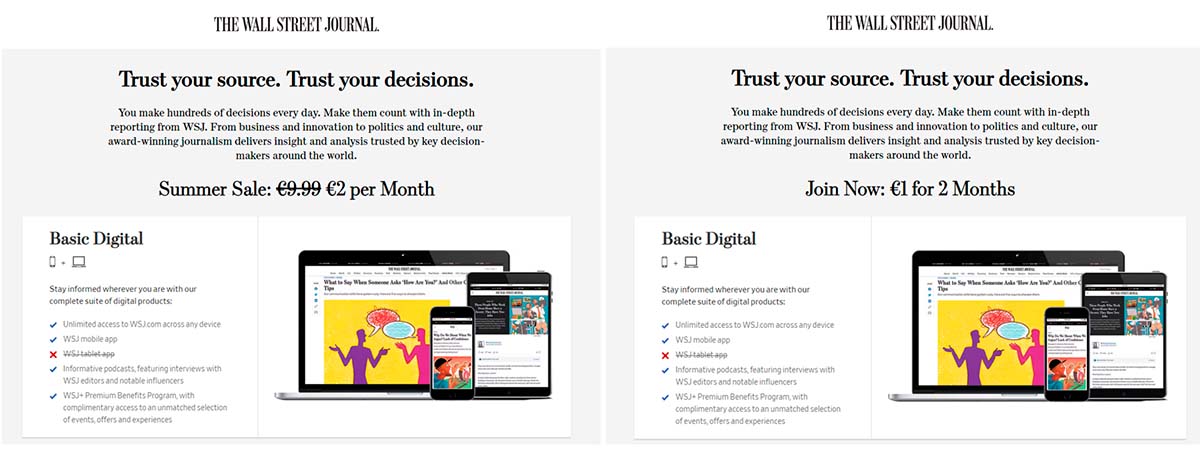 The Wall Street Journal es otro de los medios que está haciendo también una oferta muy agresiva por apenas unos euros al año, incluyendo algunas de las webs de la misma editora, como Marketwatch o Barrons. Y también sólo para el WSJ. En Estados Unidos y otros países, la promoción se ha lanzado por un dólar para dos meses, y después ya a 10 dólares al mes, pero si eres un lector europeo, en muchos casos salta una oferta de dos euros al mes durante todo un año, es decir, 24 euros al año, mucho más económico que para los lectores con IP estadounidense.