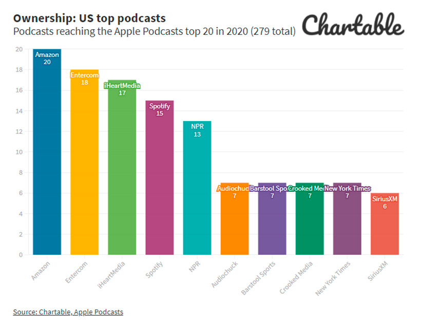 - Teniendo en cuenta sólo los programas que han alcanzado el top 20 en Apple Podcasts durante 2020, Amazon se erige como líder. Con una sola adquisición (la compra de Wondery), Amazon ahora posee más podcasts que alcanzaron el Apple Top 20 el año pasado que cualquier otra compañía.