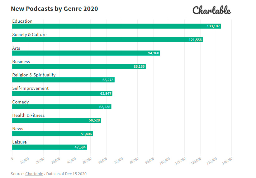 Por contenidos e ideas para podcast, ya sin diferenciación por idiomas, sino en datos mundiales, la educación centró buena parte de los nuevos podcast que se crearon en 2020, con 133.000, seguido de sociedad y cultura, arte y negocios. Generalmente los temas de nicho suelen ser los que mejor funcionan, si se están buscando ideas para podcast.