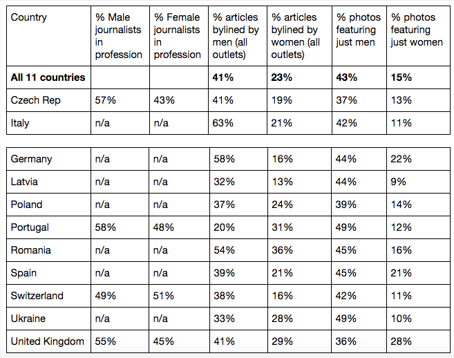 La única excepción a la supremacía masculina fue Portugal, donde las firmas de autoras femeninas eran más frecuentes que los hombres, en una proporción de 31% a 20%. Pero incluso aquí, el uso de fotografías de hombres fue muy superior al de las mujeres, en un 49% a 12%.
