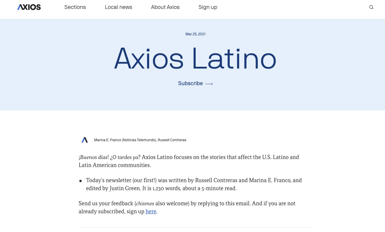 La comunidad latina es la mayor minoría étnica de Estados Unidos, según datos divulgados en agosto de 2020 por la Oficina del Censo estadounidense. Para llegar a esta audiencia, Axios y Noticias Telemundo se aliaron para lanzar Axios Latino, un newsletter semanal en inglés que todos los jueves envían por correo electrónico.