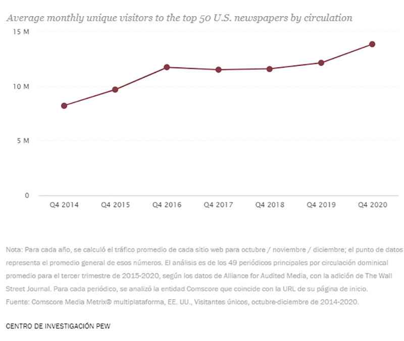 Según los datos que ha hecho públicos el centro de investigación Pew, que toman como referencia los 50 principales diarios de EEUU, en el cuarto trimestre de 2020 hubo un promedio de 13,9 millones de visitantes únicos mensuales (en todos los dispositivos) para estos 50 periódicos principales. Esta cifra supone un 14% más que en 2019, que a su vez fue ya un 5% más alta que la de 2018.