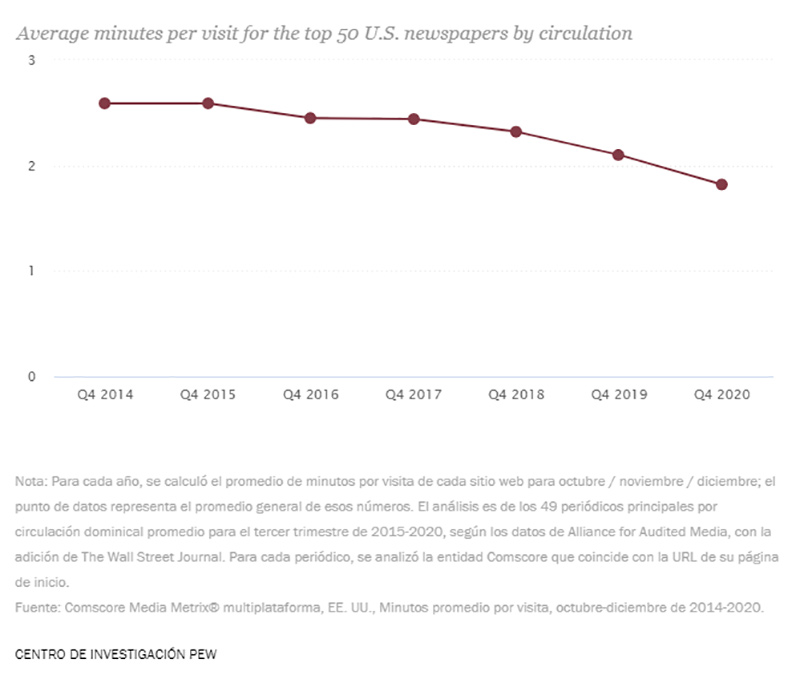 Sin embargo, el promedio de minutos por visita de los 50 periódicos más importantes de EEUU, según la circulación, ya fue menor de dos minutos en el cuarto trimestre de 2020. Esto es aproximadamente 45 segundos menos que cuando el Pew Research empezó a rastrear este dato en el cuarto trimestre de 2014.