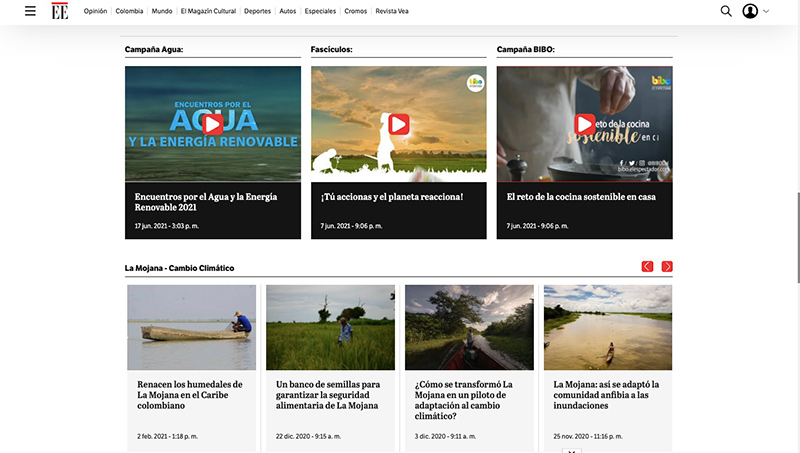 Además, el medio tiene cuatro newsletters. Uno es sobre agua, ambiente y cambio climático. Y hace pocas semanas, El Espectador relanzó el micrositio de Ambiente, que desde ahora aloja un home para cada uno de los proyectos.