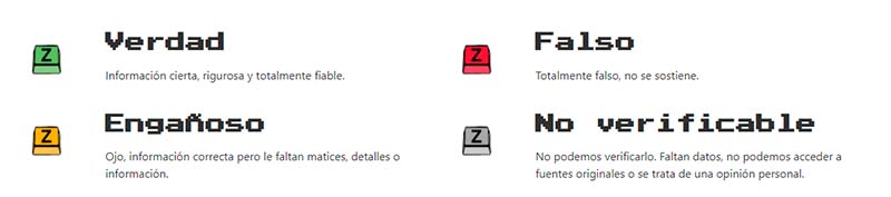FactZ, tras preguntar a fuentes oficiales y primarias, consultar datos públicos, verificar fotografías e imágenes y buscar el origen de la información, en cada caso, clasifica los contenidos en cuatro categorías: verdad, falso, engañoso y no verificable.