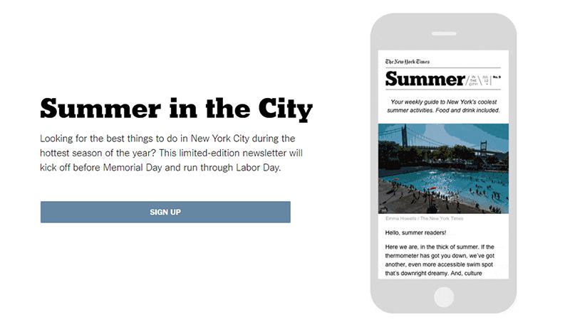 Con Summer in the City, The New York Times se dirige a los suscriptores no para recordarles una mera agenda de actos, sino que cada newsletter se centra en un barrio de Nueva York y propone un plan para una tarde o una noche bien aprovechada en ese barrio, ayudando a neoyorquinos y turistas a descubrir los rincones de la ciudad, ligados a propuestas de ocio.