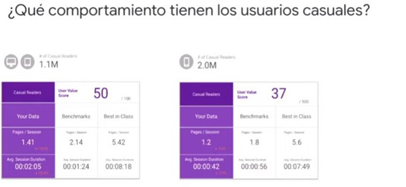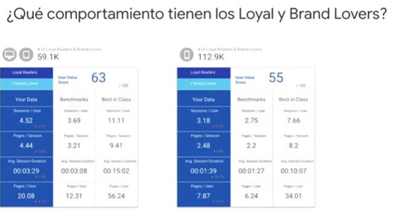 La columna azul es información de nuestro sitio. La que está en blanco es la comparación con los otros medios. Con esta herramienta se puede analizar también la fidelidad del lector y relacionarlo con el dispositivo desde donde consumen el sitio; ¿móvil o desktop?
