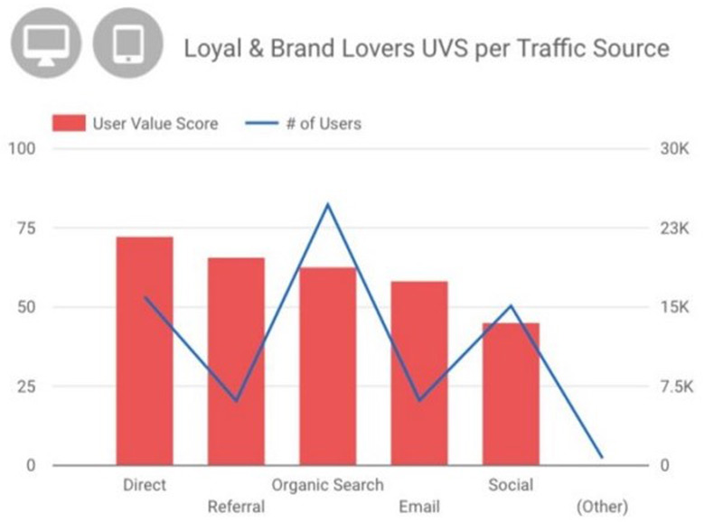 En cada columna hay una fuente de tráfico diferente: email, red social, buscadores. En general, los usuarios que provienen de email tienen más valor dado que permanecen más tiempo y visitan más páginas.