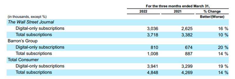 The Wall Street Journal promedió más de 3 millones de suscripciones digitales en el trimestre, frente a los 2,9 millones del trimestre anterior. Incluyendo la edición impresa, promedió 3,7 millones de suscripciones en el período.