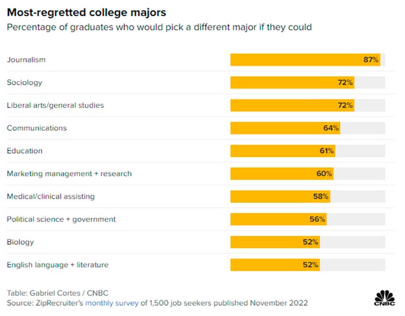 En concreto, la encuesta realizada por ZipRecruiter, de la que se hace eco la CNBC y Linkedin, revela que un 87% de los graduados en Periodismo elegirían una carrera distinta si pudieran, seguido de Sociología, con un 72% de arrepentidos. El top 10 lo completan en orden descendiente Artes, Comunicaciones, Educación, Marketing, carreras médicas y asistenciales, Ciencias Políticas, Biología y lengua y literatura inglesa.