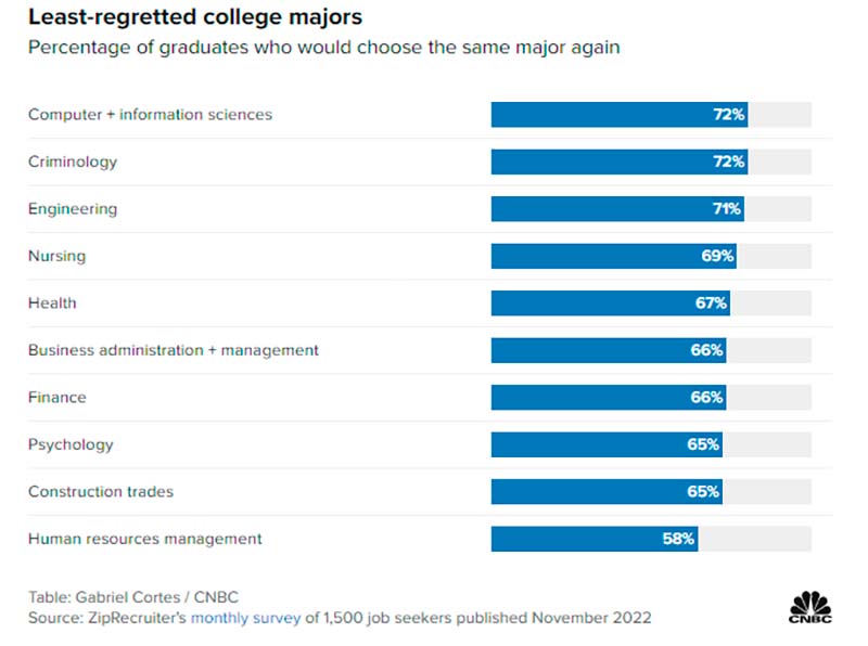 En el lado contrario, en el de las carreras con menos arrepentimiento, la lista la lidera Informática, seguido de Criminología e Ingeniería.