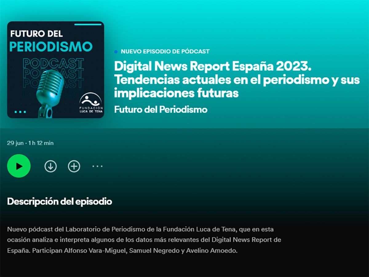 Nuevo pódcast del Laboratorio de Periodismo de la Fundación Luca de Tena, que en esta ocasión analiza e interpreta algunos de los datos más relevantes del Digital News Report de España. Participan Alfonso Vara-Miguel, Samuel Negredo y Avelino Amoedo.
