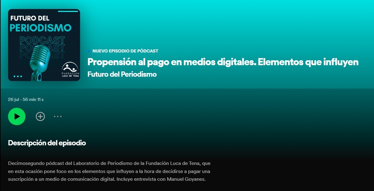 Decimosegundo pódcast del Laboratorio de Periodismo de la Fundación Luca de Tena, que en esta ocasión pone foco en los elementos que influyen a la hora de decidirse a pagar una suscripción a un medio de comunicación digital, entre otros detalles, de la mano de Manuel Goyanes, uno de los mayores especialistas en este campo, con numerosas investigaciones al respecto.