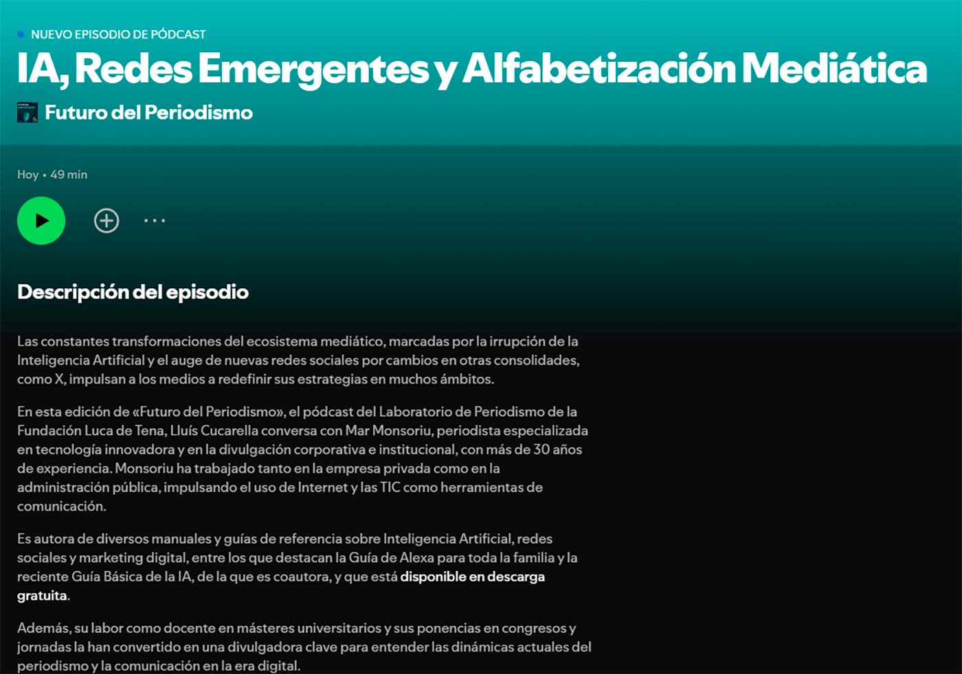 En esta edición de «Futuro del Periodismo», el pódcast del Laboratorio de Periodismo de la Fundación Luca de Tena, Lluís Cucarella conversa con Mar Monsoriu, periodista especializada en tecnología innovadora y en la divulgación corporativa e institucional, con más de 30 años de experiencia. Monsoriu ha trabajado tanto en la empresa privada como en la administración pública, impulsando el uso de Internet y las TIC como herramientas de comunicación.